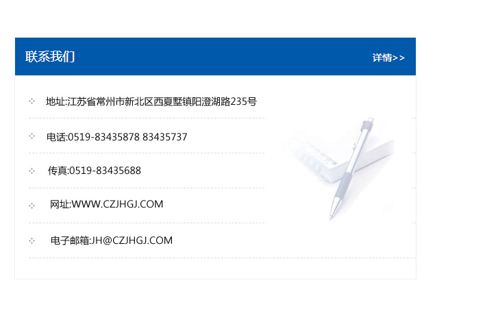 地址:常州市新北區友邦商務大廈1幢16、17層  電話:0519-85101652  傳真:0519-85112595  郵編:213022  網址:www_cz-jiayue_cn.matonghui.com  郵箱:xiajifengaa@163.com